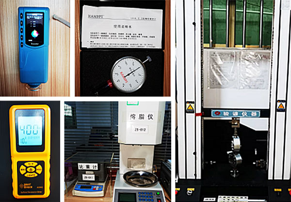 本公司擁有萬(wàn)能材料試驗(yàn)機(jī)、標(biāo)準(zhǔn)光源箱、熔脂儀、比重計(jì)、硬度計(jì)、游標(biāo)卡尺、厚度規(guī)等專(zhuān)業(yè)的檢測(cè)設(shè)備。